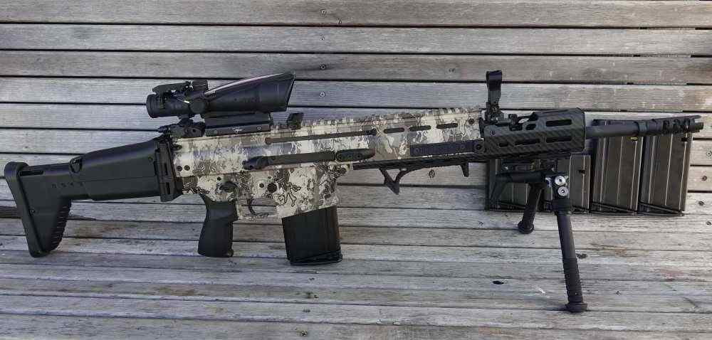 Included with the rifle are five OEM FN magazines. The firearm is configured with its factory reciprocating charging handle assembly and carbon fiber hand guard .