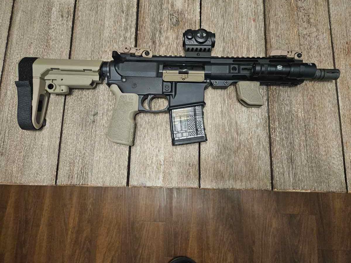 7.5 inch ar15 pistol with fde furniture dust cover sba3 brace grip and forward grip cylee red dot translucent 20 round magazine. I am only looking to trade for a mac9 ds comp. Located in manvel rosharon area will meet in manvel rosharon area. Text me at 346four46two102 for fastest response.