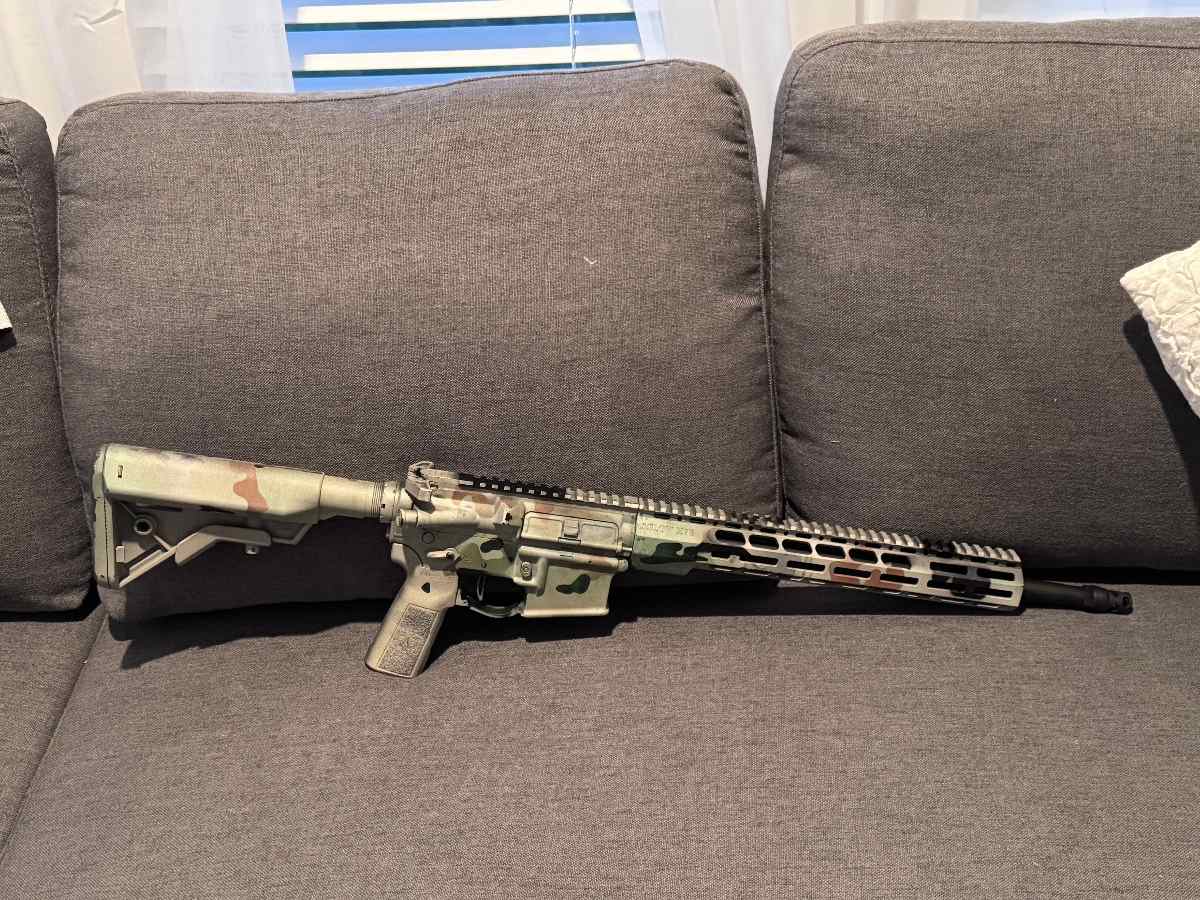 It started out as a 13.7 with pinned Nox. I changed the barrel to a criterion 16 so that I can utilize plan b. Changed the trigger to a LaRue. Painted it in multicam. Only trades are S&W M&P2.0/Walther PDP.