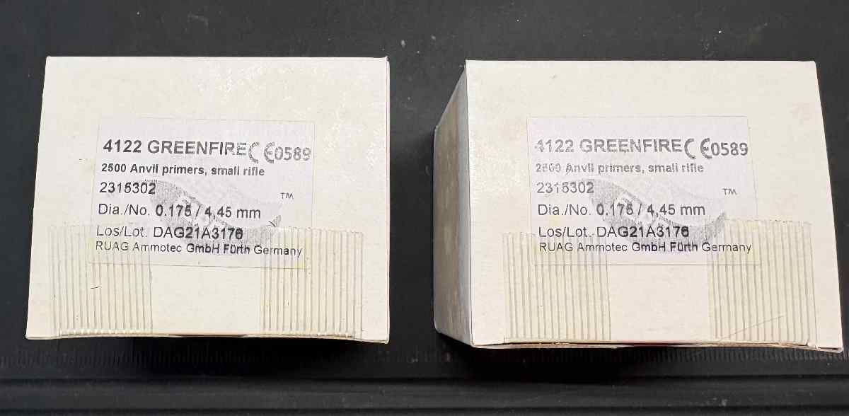 RUAG Small Rifle Primers Green Fire (Lead Free) 2500ct box with 250 per sleeve NICKEL Plated bought from Raven Rocks Precision 3-months ago, but I'm getting out of reloading rifles due to shoulder surgery. I have 2-boxes both unopened. I have used 15,000 of these primers without issues. These are being sold at the listed price box below of 2,500 and I'm not interested in trades besides Small Pistol Primers or cash.