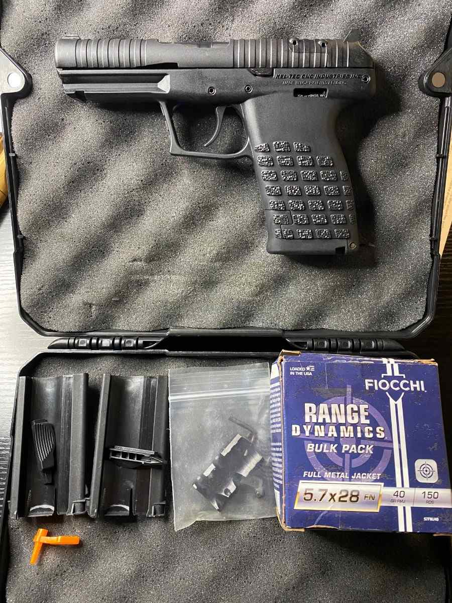 Here is a Kel-Tec PR57 I bought last year up for trade. Its in new condition with two range trips under its belt and comes with about 50 rounds of 5.7x28
